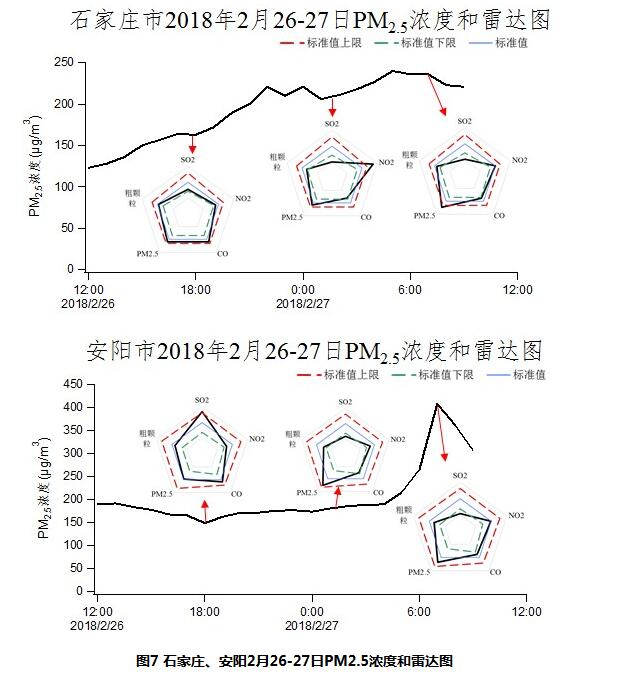 此外,污染物特征雷達圖也顯示(圖7),區(qū)域內(nèi)污染較重的石家莊和安陽等城市總體呈現(xiàn)受山前靜穩(wěn)天氣等不利氣象條件影響、本地污染物排放累積的特征。
