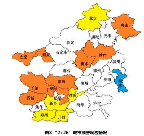 截止2月27日,京津冀及周邊地區(qū)共30個城市啟動預(yù)警響應(yīng),其中15個城市發(fā)布橙色預(yù)警,14個城市發(fā)布黃色預(yù)警,1個城市發(fā)布藍色預(yù)警?!?+26”城市中有15個城市發(fā)布重污染天氣應(yīng)急響應(yīng),9個城市發(fā)布橙色預(yù)警,5個城市發(fā)布黃色預(yù)警,1個城市發(fā)布藍色預(yù)警(圖8)