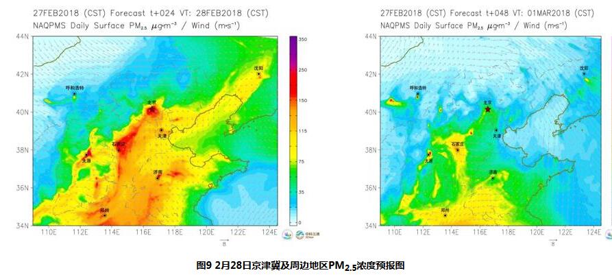 因東北高壓系統(tǒng)南下受阻,27日白天冷空氣過程顯著偏弱,京津冀中部污染過程預(yù)計將持續(xù)至28日。受區(qū)域性弱風、高濕及逆溫等不利氣象條件影響,京津冀中南部、山西南部、山東西部和河南北部可能出現(xiàn)中至重度污染過程,影響范圍主要包括北京、天津、石家莊、保定、衡水、邢臺、邯鄲、晉城、濟南、德州、淄博、聊城、鄭州、安陽、鶴壁、焦作、新鄉(xiāng)、濮陽等城市,部分城市可能達到嚴重污染,PM2.5小時濃度峰值可能達到或超過350微克/立方米。28日夜間至3月1日凌晨,受冷空氣過程影響,包括北京、天津在內(nèi)的京津冀中部城市群空氣質(zhì)量有望改善(圖9)。