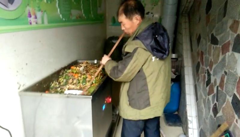 工作人員在使用廚余粉碎機(jī)。