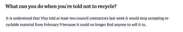 Visy稱中國的禁令是此舉的理由。面對(duì)媒體,Visy 拒絕采訪,Wheelie Waste 也沒有對(duì)此事件做任何評(píng)論。