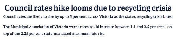 據(jù)《The Age》報(bào)道,維州垃圾回收危機(jī)將造成市政費(fèi)上漲高達(dá)5%。市政費(fèi)是市政廳對(duì)管轄區(qū)內(nèi)所有業(yè)主(包括居民和企業(yè))征收的費(fèi)用,其中有一部分會(huì)用于當(dāng)?shù)氐睦幚怼?/p>