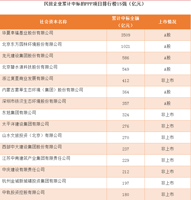 上榜民營(yíng)企業(yè)PPP前15強(qiáng)的企業(yè),累計(jì)中標(biāo)的PPP項(xiàng)目金額最低門檻是180億元。