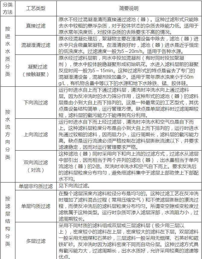 表1-2 快速過濾工藝分類及說明