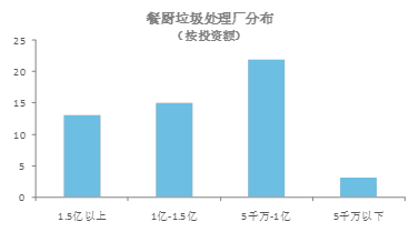 據(jù)E20數(shù)據(jù)中心不完全統(tǒng)計,目前在庫餐廚項目處理規(guī)?;咎幱?00噸/日及以下,且50-100噸/日處理規(guī)模占比最多;投資額1億元以下的餐廚廠占比約一半。從投資額與處理規(guī)???,餐廚垃圾廠在市政基礎(chǔ)設(shè)施投資建設(shè)中處于適中位置。