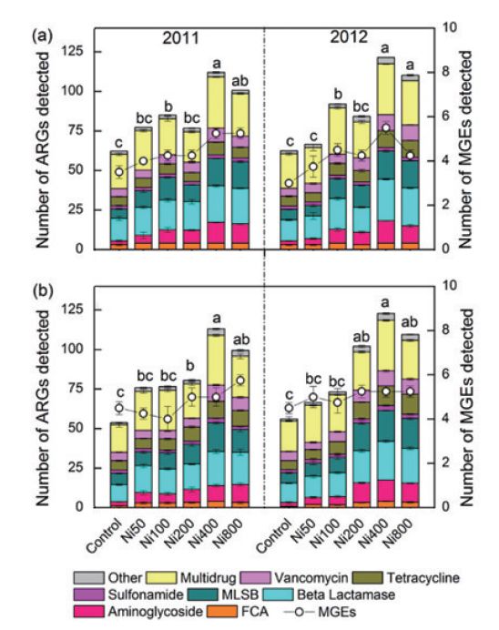 抗生素對細(xì)菌感染、致病微生物感染類疾病的防治具有重要作用,但由此而來的抗性基因的快速增加和傳播也威脅著人體健康。抗性基因的研究越發(fā)受到學(xué)者關(guān)注,成為研究熱點。除抗生素選擇產(chǎn)生抗性基因外,環(huán)境中重金屬對抗生素抗性的選擇和傳播擴(kuò)散具有重要作用。中國科學(xué)院生態(tài)環(huán)境研究中心Hu等通過對Ni長期污染土壤誘導(dǎo)的抗性基因進(jìn)行研究,發(fā)現(xiàn)在長期不同程度Ni污染下,共檢測到149種抗性基因,以多藥和β-內(nèi)酰胺類抗生素抗性為主,抗性基因的頻率和豐度隨Ni污染程度的增加而升高(圖3);抗性基因與可移動抗性原件具有顯著相關(guān)性,表明Ni污染增加了抗性基因的水平轉(zhuǎn)移,該水平轉(zhuǎn)移與intI1整合子有關(guān)。區(qū)別于以往重金屬的直接毒性風(fēng)險,該研究闡述了重金屬在土壤環(huán)境中的間接風(fēng)險-增加抗性基因產(chǎn)生和傳播風(fēng)險。