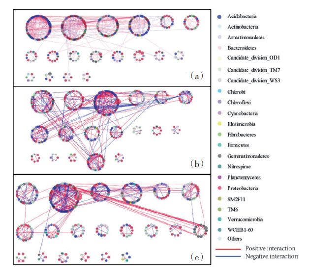 圖9不種植物(a)和種植大豆(b)與玉米(c)對鎘污染土壤細(xì)菌網(wǎng)絡(luò)關(guān)系的影響