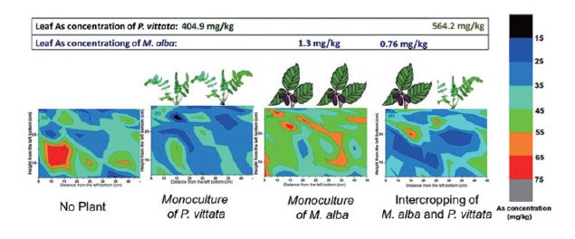 除降低可食作物對重金屬吸收外,在重金屬污染土壤上種植經(jīng)濟(jì)作物,阻控重金屬在食物鏈中的傳遞風(fēng)險,也是污染農(nóng)田安全利用的措施之一。華中農(nóng)業(yè)大學(xué)Yang等針對重金屬污染土壤研究重金屬耐性經(jīng)濟(jì)作物3種種植模式(油菜-向日葵、油菜-花生、油菜-芝麻),對土壤重金屬去除效應(yīng)和農(nóng)作物中重金屬濃度的影響進(jìn)行了研究。結(jié)果表明,油菜-向日葵種植模式去除Cd最高,可達(dá)459g˙ha-1,去除率為1.98%;利用正己烷提取后作物油符合相應(yīng)標(biāo)準(zhǔn),去油后種子殘渣再經(jīng)酒石酸鉀提取后,其重金屬濃度低于飼料標(biāo)準(zhǔn)。經(jīng)濟(jì)作物與超積累植物間作,在安全生產(chǎn)的同時也能去除土壤污染物,實現(xiàn)修復(fù)目的。但是在超積累植物和其他植物間作體系下,超積累植物對重金屬活化和吸收機(jī)制還不清楚,超積累植物是否活化重金屬,增加非超積累植物對重金屬吸收。中國科學(xué)院地理科學(xué)與資源研究所Wan等開展了As超積累植物蜈蚣草和桑樹間作的研究,探討了邊生產(chǎn)邊修復(fù)機(jī)制。與單作相比,間作處理條件下蜈蚣草中As濃度顯著增加、桑樹As則顯著降低;對不同處理下土壤As的空間分布分析發(fā)現(xiàn),不論單作或間作處理蜈蚣草根周圍土壤As濃度較低,沒有活化土壤As(圖10),且在間作處理下桑樹葉中As濃度符合國家飼料標(biāo)準(zhǔn)。