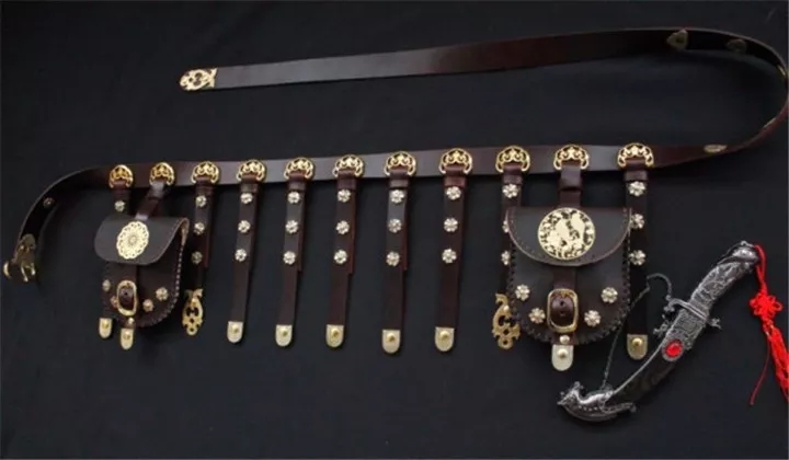 《新唐書》中有關(guān)于服裝形制的記載,唐人常配有一種叫蹀躞(dié xiè)七事的腰帶,上面掛著七種不同用處的物件,哪七種?分別為:佩刀、刀子、礪石、契苾真、噦厥、針筒、火石。這個(gè)噦厥(yuě jué),就是我們生活中常見的垃圾袋。