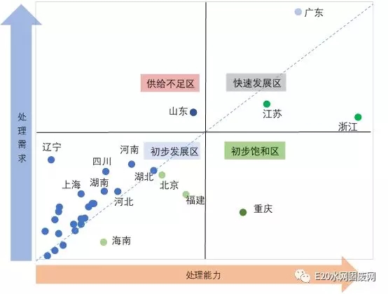 在基本供需關(guān)系兩大分區(qū)的基礎(chǔ)上,根據(jù)處理能力及當(dāng)前收運(yùn)率普遍較低情況下,各省處理需求的不同,我國(guó)餐廚垃圾處理市場(chǎng)可基本劃分為四大陣營(yíng)。
