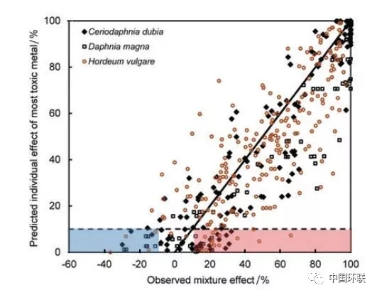 圖2 重金屬復(fù)合污染條件下模型預(yù)測和觀測的毒性對比