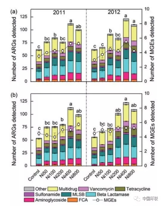 抗生素對細(xì)菌感染、致病微生物感染類疾病的防治具有重要作用,但由此而來的抗性基因的快速增加和傳播也威脅著人體健康??剐曰虻难芯吭桨l(fā)受到學(xué)者關(guān)注,成為研究熱點(diǎn)。除抗生素選擇產(chǎn)生抗性基因外,環(huán)境中重金屬對抗生素抗性的選擇和傳播擴(kuò)散具有重要作用。中國科學(xué)院生態(tài)環(huán)境研究中心Hu等通過對Ni長期污染土壤誘導(dǎo)的抗性基因進(jìn)行研究,發(fā)現(xiàn)在長期不同程度Ni污染下,共檢測到149種抗性基因,以多藥和β-內(nèi)酰胺類抗生素抗性為主,抗性基因的頻率和豐度隨Ni污染程度的增加而升高(圖3);抗性基因與可移動抗性原件具有顯著相關(guān)性,表明Ni污染增加了抗性基因的水平轉(zhuǎn)移,該水平轉(zhuǎn)移與intI1整合子有關(guān)。區(qū)別于以往重金屬的直接毒性風(fēng)險(xiǎn),該研究闡述了重金屬在土壤環(huán)境中的間接風(fēng)險(xiǎn)-增加抗性基因產(chǎn)生和傳播風(fēng)險(xiǎn)。