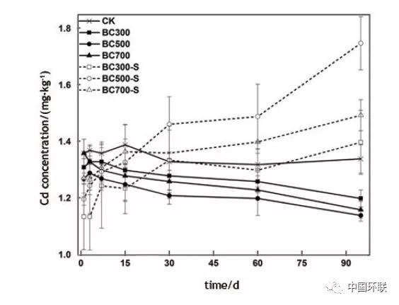 圖8 不同培養(yǎng)時(shí)間下生物炭(BC300,BC500,BC700)和改性生物炭(BC300-S,BC500-S,BC700-S)對土壤全量Cd濃度變化的影響