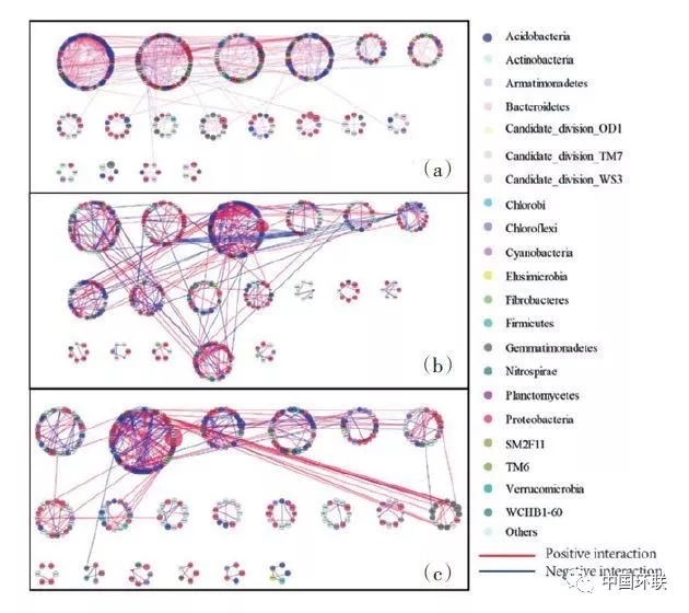 圖9 不種植物(a)和種植大豆(b)與玉米(c)對鎘污染土壤細(xì)菌網(wǎng)絡(luò)關(guān)系的影響