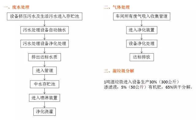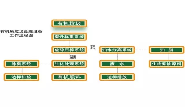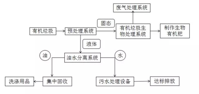 有機(jī)垃圾先進(jìn)入“預(yù)處理系統(tǒng)”,處理完成后,固體物料進(jìn)入有機(jī)垃圾生物處理系統(tǒng)”,液體進(jìn)入“油水分離系統(tǒng)”;固體最后的產(chǎn)出物為生物有機(jī)肥;經(jīng)過(guò)油水分離后的油集中回收后制作成洗滌用品,廢水經(jīng)污水處理設(shè)備處理后達(dá)標(biāo)排放。