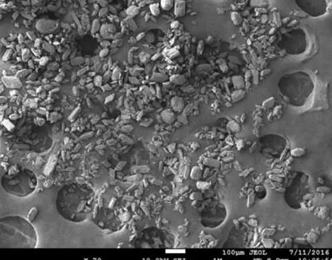 根據化學分析結果可見,除霧器上的垢物與石膏的組成較為接近,主要成分均為CaS04˙2H20。結合除霧器的工作機理,可以認為除霧器的垢物與石膏的來源均為脫硫漿液所攜帶的固體顆粒物。但是掃描電鏡微觀顯示其晶體形態(tài)完全不同,除霧器垢物是顆粒與片狀晶體的混合物,而脫硫石膏呈現(xiàn)出顆粒狀(或短柱狀)晶體結構。