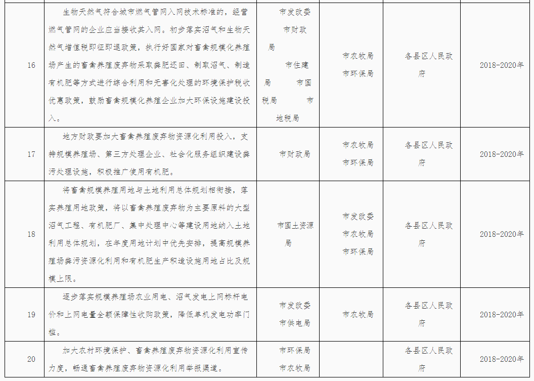 (五)推動(dòng)種養(yǎng)循環(huán)發(fā)展。各縣區(qū)要盡快編制種養(yǎng)循環(huán)發(fā)展規(guī)劃,引導(dǎo)建立糧飼統(tǒng)籌、農(nóng)牧結(jié)合、養(yǎng)防并重、種養(yǎng)一體的種養(yǎng)循環(huán)綠色發(fā)展機(jī)制,促進(jìn)畜牧業(yè)持續(xù)健康發(fā)展。推動(dòng)建立畜禽糞污等農(nóng)業(yè)有機(jī)廢棄物收集、轉(zhuǎn)化、利用網(wǎng)絡(luò)體系,支持采取政府和社會(huì)資本合作(PPP)模式,調(diào)動(dòng)社會(huì)資本在養(yǎng)殖密集區(qū)域建立糞污集中處理中心,探索規(guī)?;I(yè)化、社會(huì)化運(yùn)營(yíng)機(jī)制,加快畜禽糞污處理全產(chǎn)業(yè)鏈建設(shè)。培育壯大多種類型的糞污處理社會(huì)化服務(wù)組織,實(shí)行專業(yè)化生產(chǎn)、市場(chǎng)化運(yùn)營(yíng)。鼓勵(lì)建立受益者付費(fèi)機(jī)制,保障第三方處理企業(yè)和社會(huì)化服務(wù)組織合理收益。加強(qiáng)糞肥還田技術(shù)指導(dǎo),鼓勵(lì)沼液和經(jīng)無(wú)害化處理的畜禽養(yǎng)殖廢水作為肥料科學(xué)還田利用。優(yōu)先支持現(xiàn)代農(nóng)業(yè)示范區(qū)、農(nóng)業(yè)可持續(xù)發(fā)展試驗(yàn)示范區(qū)和現(xiàn)代農(nóng)業(yè)產(chǎn)業(yè)園在田間地頭配套建設(shè)管網(wǎng)和儲(chǔ)糞(液)池等方式,解決糞肥還田“最后一公里”問(wèn)題。到2020年新(改擴(kuò))建大中型沼氣21處,新(改擴(kuò))建有機(jī)肥生產(chǎn)企業(yè)5家。
