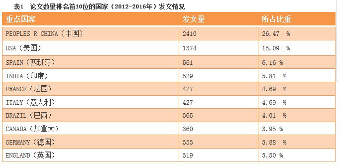 根據(jù)WOS檢索結(jié)果,全世界共有144國家或地區(qū)發(fā)表了土壤污染防治領(lǐng)域相關(guān)文獻(xiàn)。其中論文數(shù)量排名在前TOP10的國家(詳見表1)共發(fā)表了5760篇文獻(xiàn),占總量的63.25%。我國在論文數(shù)量上占有絕對(duì)的優(yōu)勢(shì),2012年—2016年共發(fā)表論文2410篇,位居榜首。