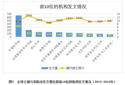 全球共有5420家科研機(jī)構(gòu)或單位發(fā)表了土壤污染防治領(lǐng)域的文獻(xiàn),發(fā)文量位居前10名的機(jī)構(gòu)或單位以科研機(jī)構(gòu)或者大學(xué)為主(見圖3),共發(fā)表1873篇文獻(xiàn),占該領(lǐng)域發(fā)文總量的20.56%。這10家機(jī)構(gòu)中,中國機(jī)構(gòu)和美國機(jī)構(gòu)數(shù)量最多,各有3個(gè),法國的機(jī)構(gòu)有2個(gè),西班牙和印度機(jī)構(gòu)各有1個(gè)。其中中國科學(xué)院是發(fā)文數(shù)最多的機(jī)構(gòu)。