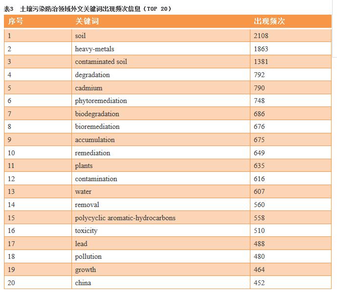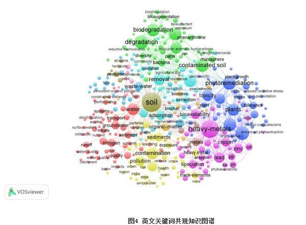 將webofscience上檢索到的9323條英文數(shù)據(jù)導(dǎo)入VOSviewer,共分析了491個(gè)關(guān)鍵詞,得出的高頻關(guān)鍵詞見表3。據(jù)統(tǒng)計(jì),soil(土壤),heavy-metals(重金屬),出現(xiàn)頻次最高,可見重金屬的污染防治一直是領(lǐng)域的關(guān)注重點(diǎn)。degradation(退化)排名第四,反映出近5年來土壤退化問題備受關(guān)注。此外,植物修復(fù)和微生物修復(fù)也是近來的研究熱點(diǎn)。