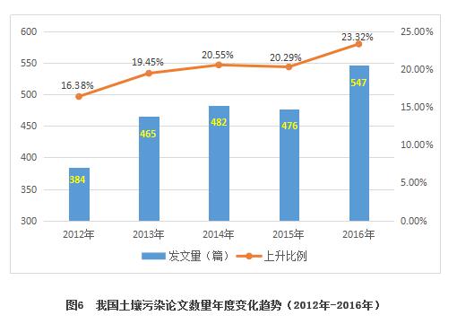 據(jù)統(tǒng)計(jì),中國知網(wǎng)收錄的近5年土壤污染防治核心期刊文獻(xiàn)共2345篇,年度發(fā)文量總體呈上升趨勢(shì)(見圖6),上升率由2012年的16.38%升至2016年的23.32%,高出了6.94%,從年度論文數(shù)量的變化中可以看出我國學(xué)術(shù)界對(duì)土壤污染防治的關(guān)注度上升,說明我國科研人員越來越重視土壤污染防治的研究。