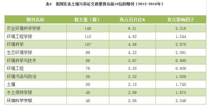 據(jù)統(tǒng)計(jì),國內(nèi)發(fā)表土壤污染防治論文數(shù)量排名前10位的期刊如表4所示?!掇r(nóng)業(yè)環(huán)境科學(xué)學(xué)報(bào)》載文量最高,共148篇,占總發(fā)文量的6.31%;而《環(huán)境工程學(xué)報(bào)》以113篇的載文量,位居第二,其論文數(shù)量占總發(fā)文量的4.82%;《環(huán)境科學(xué)》以第二名6篇之差位列第三,共107篇,占總發(fā)文量的4.56%。