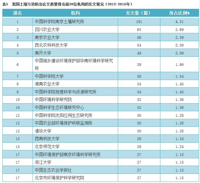 截至2016年發(fā)表的土壤污染防治相關(guān)研究論文中,發(fā)文量位居前20位的科研機(jī)構(gòu)或單位見表5。中國科學(xué)院南京土壤研究所發(fā)文量101篇,以絕對(duì)性優(yōu)勢(shì)居榜首,四川農(nóng)業(yè)大學(xué)以63篇發(fā)文居第二,南京農(nóng)業(yè)大學(xué)以7篇之差位列第三。前20位的機(jī)構(gòu)中,共有10所高校入圍,其中4所是農(nóng)業(yè)類院校;科研機(jī)構(gòu)有9個(gè)入圍??梢?,高校和科研機(jī)構(gòu)是我國研究土壤污染防治的主力軍。