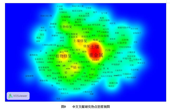 中文關(guān)鍵詞共現(xiàn)知識(shí)圖譜和熱點(diǎn)圖分別見圖7和圖8,可以發(fā)現(xiàn)該領(lǐng)域研究熱點(diǎn)集中在土壤重金屬防治技術(shù)研究,包括鎘、鉻、鋅、鉛、砷和汞及持久性有機(jī)污染物,特別是多環(huán)芳烴等的防治技術(shù)研究。在包含植物修復(fù)與微生物修復(fù)的生物修復(fù)技術(shù)研究方面熱度較高。