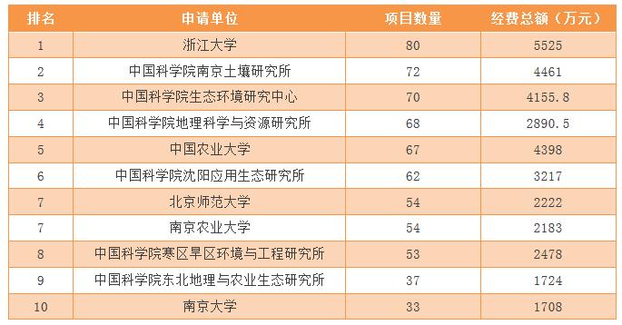 通過項目數(shù)據(jù)分析(見圖10),土壤污染防治領(lǐng)域在面上項目獲得的經(jīng)費十年總經(jīng)費額度排名第一,共計4.35億元,青年科學(xué)基金項目排名第二,約為2.13億元。排名第三位的為重點項目,共計1.02億元。面上項目是相對于重點項目而言,由于選題廣泛所以占比比其他類型要高。但是由于2013年起基金委出臺新政策,嚴(yán)格把控項目質(zhì)量。因此導(dǎo)致近幾年資助經(jīng)費呈下降走勢。