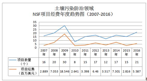 通過項目數(shù)據(jù)分析(見圖12),在土壤污染防治領(lǐng)域,美國國家科學(xué)基金資助經(jīng)費在2007年至2009年呈現(xiàn)了穩(wěn)步遞增的趨勢,2009年項目數(shù)量達(dá)到峰值30個。2010年出現(xiàn)拐點,項目數(shù)量下降為8個,2011年又開始回升,之后5年一直較為平穩(wěn),2016年有所增加,達(dá)到21個。