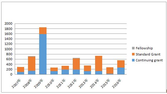 圖12:美國國家科學(xué)基金項目資助經(jīng)費年度趨勢圖(2007-2016)