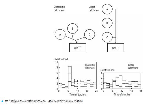 Gujer教授提醒我們污水處理系統(tǒng)除了污水處理廠之外,管網(wǎng)也是其重要的組成。污水廠的進水負荷變化在某程度是由于污染物進入管網(wǎng)時間的差異,以及管網(wǎng)分布的長度造成的,這兩個因素都跟時間這個變量有關。Gujer教授用下圖闡述了同軸排列和線性排列兩種排放模式的區(qū)別——前者的負荷變化更大,而后者的收集方式能使進水水質更穩(wěn)定。由于晝夜負荷變化很大程度上控制了生物處理過程中的硝化性能,所以使用后者的城市規(guī)劃模式對該地區(qū)的污水處理是有好處的。