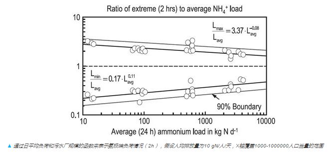 下圖總結了不同污水收集方式下氨的極端負荷和日平均負荷的比值。由于硝化處理設計的安全系數(shù)通常按照最大負荷和平均負荷的比值來設定,因此該圖能提供重要的設計信息。根據(jù)此圖,我們會發(fā)現(xiàn)安全系數(shù)的選定是個很有趣的事情——安全系數(shù)(也就是相應的SRT)設定越大,污水廠的處理能力就變小,因此專業(yè)性就降低,而且更加難以運行。