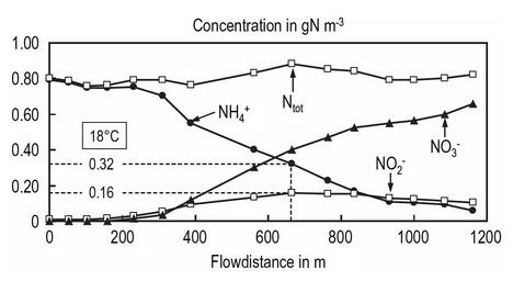 Gujer教授強調,僅僅能夠預測污水的硝化表現(xiàn)是不夠的,更重要的是要弄清出水中氮的最終去向。下圖展示的是某富營養(yǎng)化湖泊的厭氧出水排入一條小溪后,其中的氮轉化達到接近靜態(tài)的所需距離。我們需要充足的空間才能發(fā)現(xiàn)自然凈化的數(shù)據(jù)。