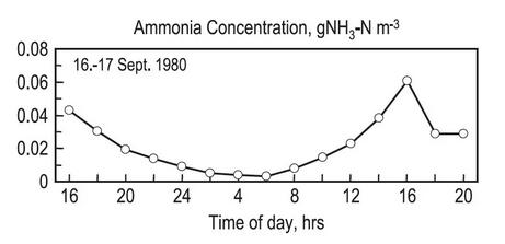 又如下圖所示,在距離某部分硝化的污水廠出水口1.5km的某河里的氨氮濃度晝夜差異。溫度、pH和氨氮負荷受到陽光的同步作用導致了這里的有毒物質濃度的極端變化。