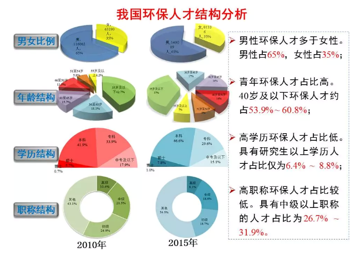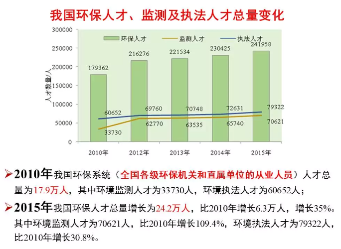 數(shù)據(jù)顯示,2010年我國環(huán)保系統(tǒng)(全國各級環(huán)保機關(guān)和直屬單位的從業(yè)人員)人才總量為17.9萬人,其中環(huán)境監(jiān)測人才為33730人,環(huán)境執(zhí)法人才為60652人。到2015年,我國環(huán)保人才總量增長為24.2萬人,比2010年增長6.3萬人,增長35%。其中環(huán)境監(jiān)測人才為70621人,比2010年增長109.4%,環(huán)境執(zhí)法人才為79322人,比2010年增長30.8%。