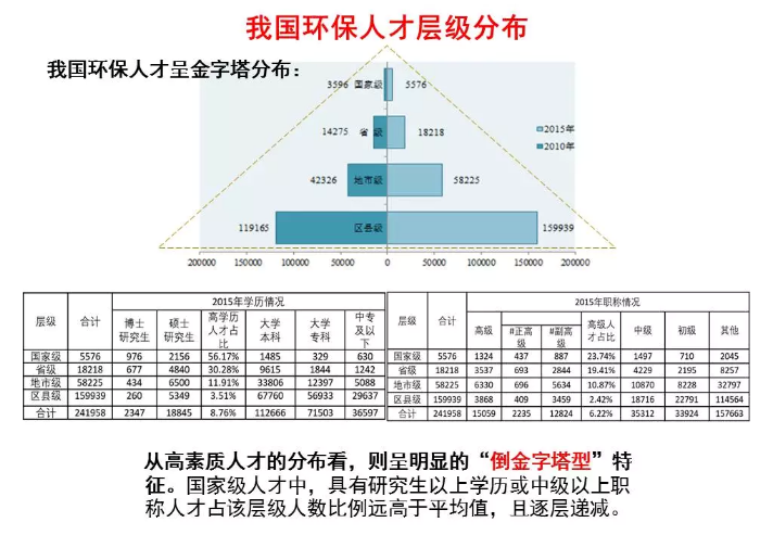 在這些環(huán)保人才中,男性占65%,女性占35%;青年環(huán)保人才占比高,高學(xué)歷、高職稱環(huán)保人才占比低。從高素質(zhì)人才的分布看,則呈明顯的“倒金字塔型”特征。國家級人才中,具有研究生以上學(xué)歷或中級以上職稱人才占該層級人數(shù)比例遠(yuǎn)高于平均值,且逐層遞減。