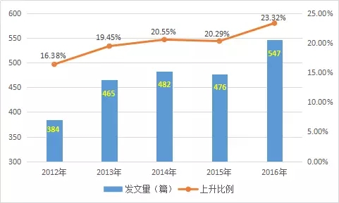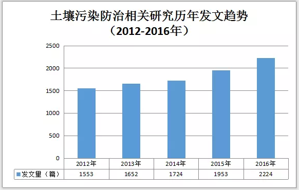 圖2土壤污染防治相關(guān)研究歷年發(fā)文趨勢(2012-2016)