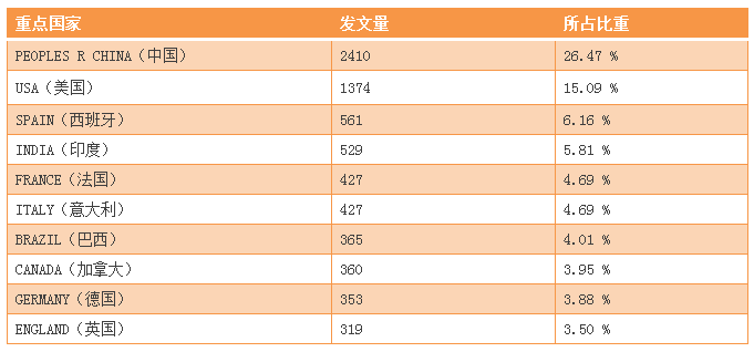 表1 論文數(shù)量排名前10位的國家(2012-2016年)發(fā)文情況