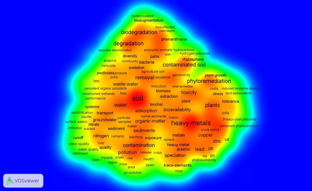 圖5 土壤污染防治領(lǐng)域2012-2016年外文文獻(xiàn)研究熱點(diǎn)密度視圖(2012-2016)