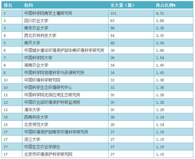 截至2016年發(fā)表的土壤污染防治相關(guān)研究論文中,發(fā)文量位居前20位的科研機(jī)構(gòu)或單位見表5。中國科學(xué)院南京土壤研究所發(fā)文量101篇,以絕對性優(yōu)勢居榜首,四川農(nóng)業(yè)大學(xué)以63篇發(fā)文居第二,南京農(nóng)業(yè)大學(xué)以7篇之差位列第三。前20位的機(jī)構(gòu)中,共有10所高校入圍,其中4所是農(nóng)業(yè)類院校;科研機(jī)構(gòu)有9個(gè)入圍??梢姡咝:涂蒲袡C(jī)構(gòu)是我國研究土壤污染防治的主力軍。