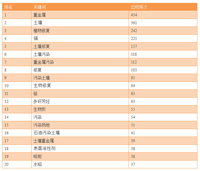 表6 土壤污染防治領(lǐng)域中文關(guān)鍵詞出現(xiàn)頻次信息(TOP 20)