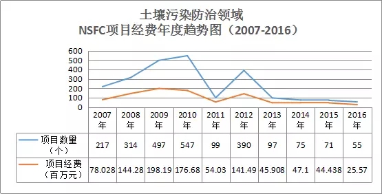 通過統(tǒng)計(jì)2007-2016十年內(nèi)我國國家自然科學(xué)基金的項(xiàng)目數(shù)據(jù),可知土壤污染防治領(lǐng)域的項(xiàng)目經(jīng)費(fèi)在2007-2010年呈穩(wěn)步上升趨勢,2010年申請通過的項(xiàng)目達(dá)峰值547個(gè),2011年有所回落,2012年又激增到390個(gè),之后幾年呈現(xiàn)了下降趨勢,2016年僅通過55個(gè)項(xiàng)目,經(jīng)費(fèi)也隨之下降,如圖9所示。