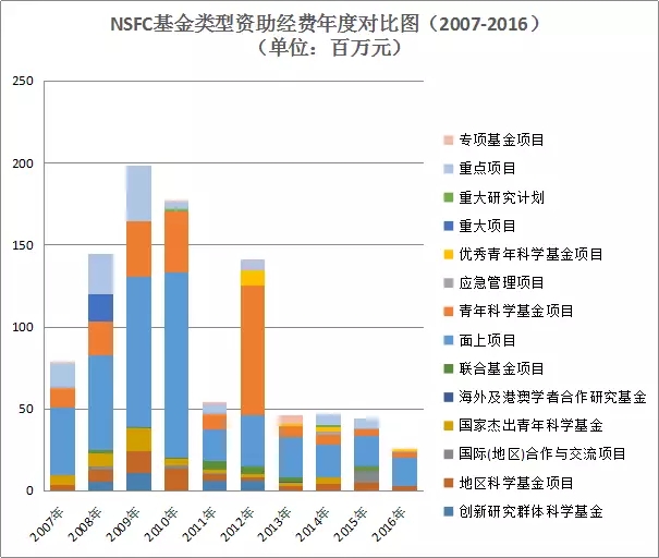 圖11 國家自然科學(xué)基金基金類型資助經(jīng)費(fèi)年度對比圖(2007-2016年)