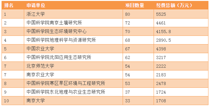 通過項(xiàng)目數(shù)據(jù)分析(見圖10),土壤污染防治領(lǐng)域在面上項(xiàng)目獲得的經(jīng)費(fèi)十年總經(jīng)費(fèi)額度排名第一,共計(jì)4.35億元,青年科學(xué)基金項(xiàng)目排名第二,約為2.13億元。排名第三位的為重點(diǎn)項(xiàng)目,共計(jì)1.02億元。面上項(xiàng)目是相對于重點(diǎn)項(xiàng)目而言,由于選題廣泛所以占比比其他類型要高。但是由于2013年起基金委出臺新政策,嚴(yán)格把控項(xiàng)目質(zhì)量。因此導(dǎo)致近幾年資助經(jīng)費(fèi)呈下降走勢。