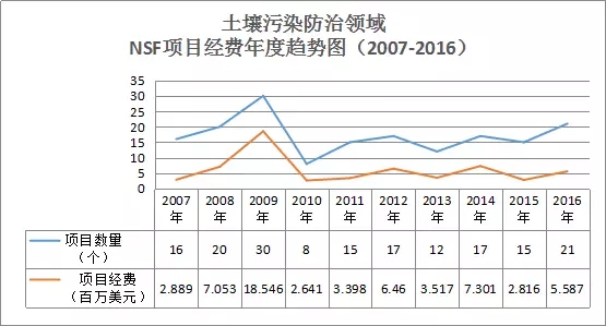 通過項(xiàng)目數(shù)據(jù)分析(見圖12),在土壤污染防治領(lǐng)域,美國國家科學(xué)基金資助經(jīng)費(fèi)在2007年至2009年呈現(xiàn)了穩(wěn)步遞增的趨勢,2009年項(xiàng)目數(shù)量達(dá)到峰值30個(gè)。2010年出現(xiàn)拐點(diǎn),項(xiàng)目數(shù)量下降為8個(gè),2011年又開始回升,之后5年一直較為平穩(wěn),2016年有所增加,達(dá)到21個(gè)。