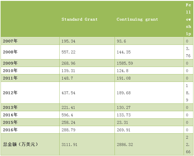 表8 美國國家科學(xué)基金項(xiàng)目資助類型經(jīng)費(fèi)表(2007-2016年)