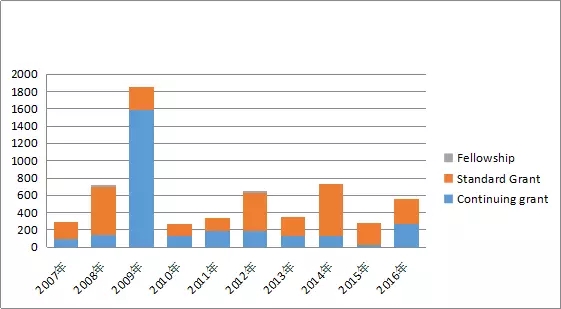 圖12:美國國家科學(xué)基金項(xiàng)目資助經(jīng)費(fèi)年度趨勢圖(2007-2016)