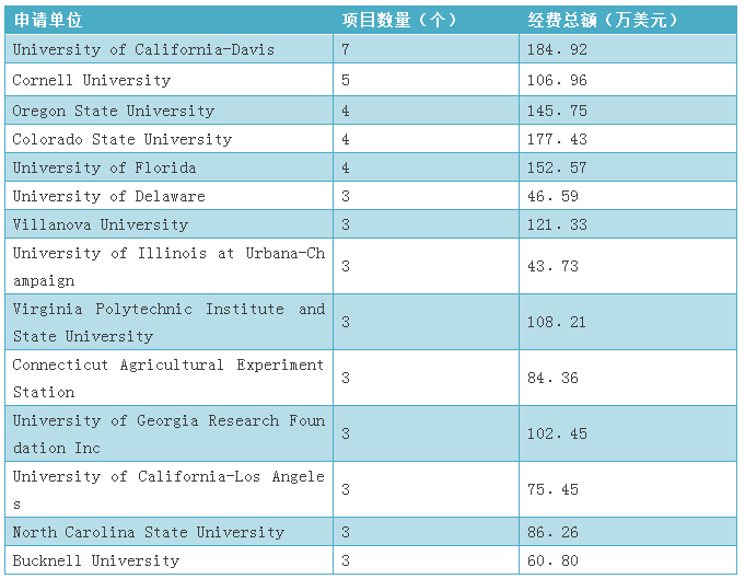 根據(jù)統(tǒng)計(jì),本領(lǐng)域申請年份在2007年至2016年間,共有135個(gè)機(jī)構(gòu)申請了美國國家科學(xué)基金。其中申請數(shù)量超過2個(gè)的機(jī)構(gòu)有14個(gè)獲得經(jīng)費(fèi)約為1496.8萬美元,如表9所示。