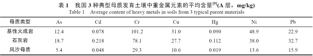 20世紀80年代進行的中國土壤元素背景值調(diào)查結(jié)果表明,不同類型母質(zhì)上發(fā)育的土壤,其重金屬含量的差異很大,如As、Cd、Cr、Cu、Hg、Ni和Pb等元素在基性火成巖和石灰?guī)r母質(zhì)發(fā)育的土壤中的平均含量大大高于風沙母質(zhì)土壤。
